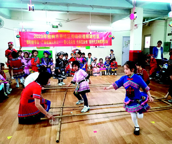 ▲4月19日,秀峰区秀峰街道榕湖社区开展“我们的节日˙广西壮族三月三——童心永向党 传承民族情”新时代文明实践活动。社区工作者、党员、退休人员、少数民族代表、志愿者等60余人欢聚一堂,唱山歌、跳竹竿舞、品美食,共度欢乐时光。 肖婷 摄