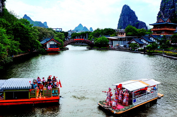 ▲在美丽的木龙湖上,叠彩区首届“江山会景处 奋进正当时”担当作为先进个人代表与参加“三月三”活动的叠彩街道办事处演员对唱山歌。 黄帅君 摄