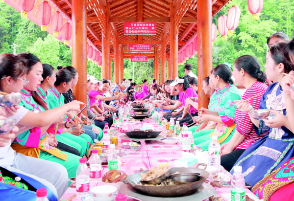 ▲春色融融三月三,又是苗乡欢歌时。为弘扬和传承民族文化,促进民族团结进步,在广西传统民俗节日“三月三”来临之际,4月19日,资源县在两水苗族乡社水村党建园民族文化广场举办“唱响苗寨非遗风情、各族欢庆‘三月三’”联欢会。临近中午,两水苗族乡摆起了特色长龙宴,共庆“三月三”。每逢节日节庆、婚嫁喜事,苗家人都会准备各种庆祝活动,长龙宴便是其中最重要、最热闹的活动之一。广场上的桌子板凳一张连着一张似条巨龙,当地的村民及外来的嘉宾、游客欢聚一堂,热闹非凡。