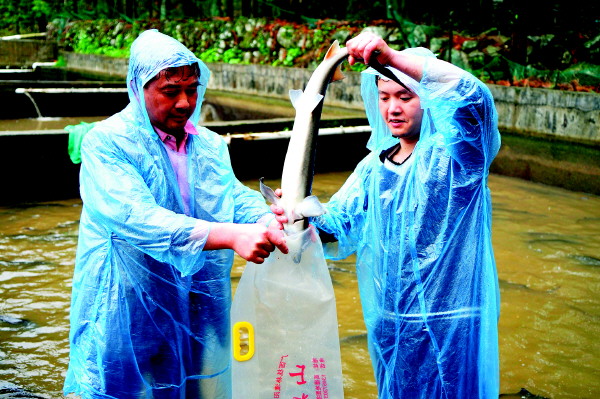 鱼塘村村民在正在给打捞上来的鲟鱼装袋、打包。