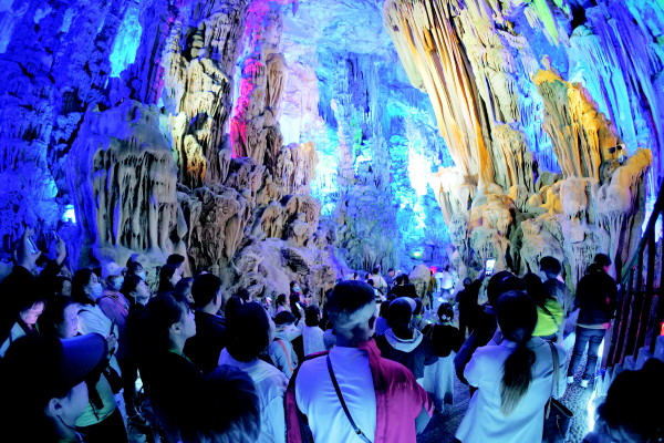 芦笛岩内,游客被五光十色的岩洞景色所吸引。