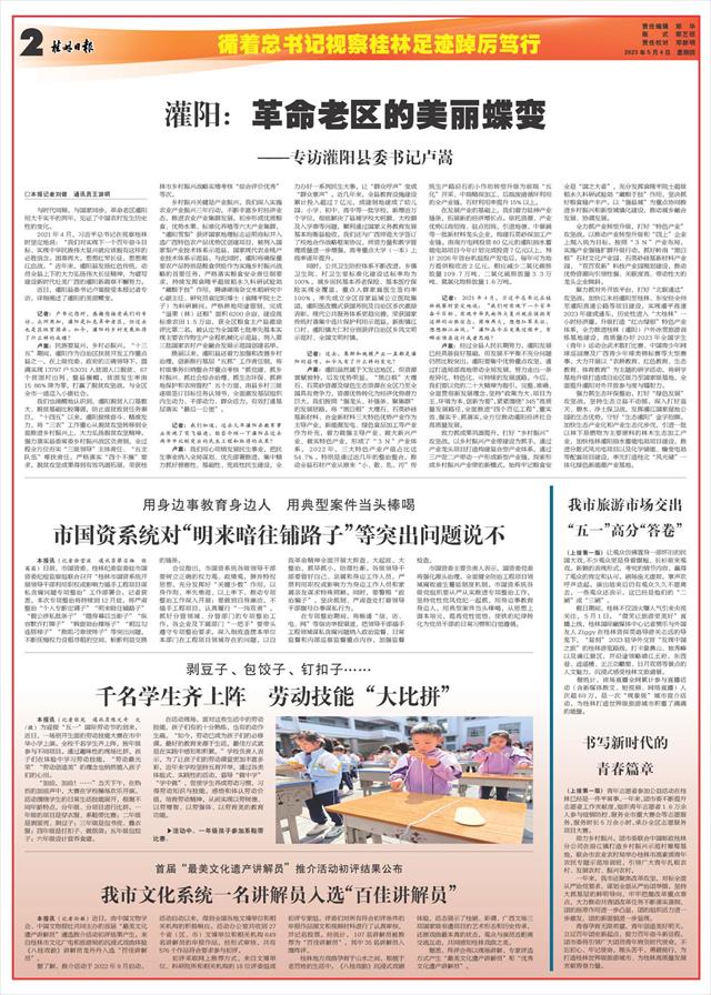 (上接第一版)青年志愿者参加公益活动在桂林已经是一件平常事。”一年来,团市委不断提升志愿者工作贡献度,组织青年志愿者1.6万余人参与疫情防控、服务全市重大赛会等志愿服务,服务时长5万余小时,承办全区志愿服务项目大赛。