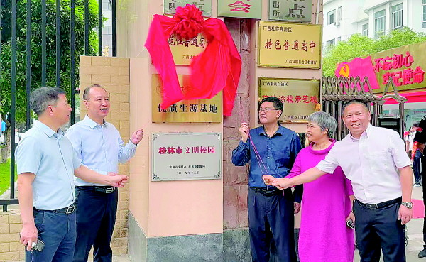 5月6日,桂林市第一中学举行了自治区示范性普通高中揭牌仪式。桂林市教育局党组成员、副局长文泽鸿,七星区人大常委会副主任张永红,桂林市第一中学校长李山,桂林市第十八中学校长黄思红,全国师德标兵、桂林市第一中学助群基金发起人董慧群以及学校师生共同参加了当天的活动。