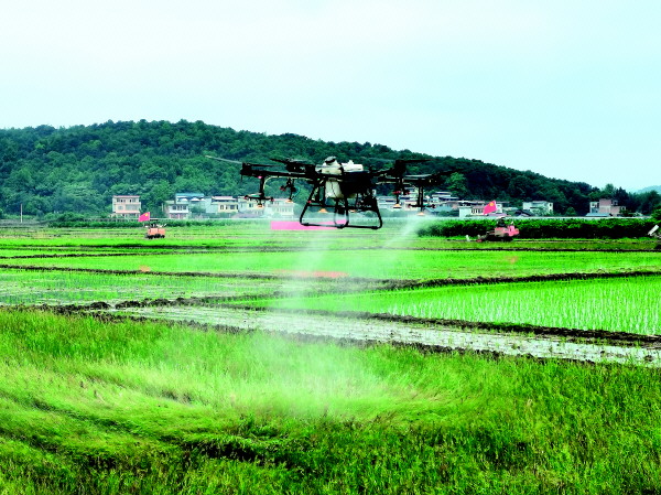 5月15日,全州县文桥镇文桥村一台农用植保无人机正在田间作业。