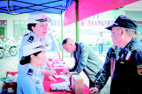 本报讯(记者蒋璇 通讯员赖江明 周苑 文/摄)5月16日上午,市公安局临桂分局交通管理大队联合两江镇人民政府、市公安局交警支队车管所、非机动车辆管理所、两江派出所、渡头派出所、茶洞派出所在两江镇客运站广场开展“我为群众办实事”车驾管大型综合服务活动,零距离服务群众,让农村地区群众在家门口享受车驾管业务便民服务。