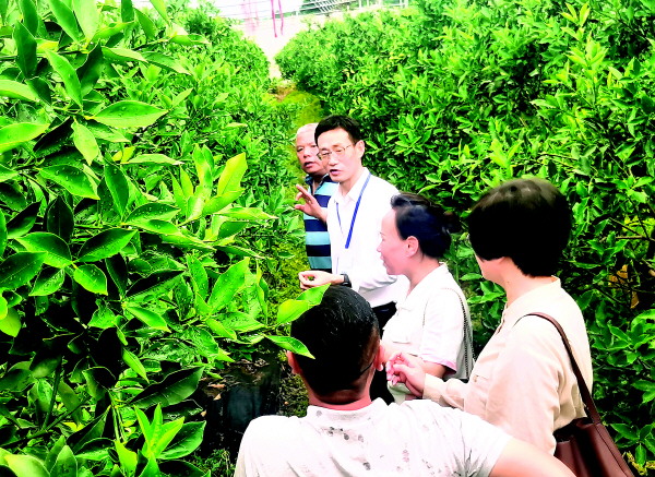 ▲博士后科技服务团成员在柑橘基地调研。(全州县农业农村局供图)