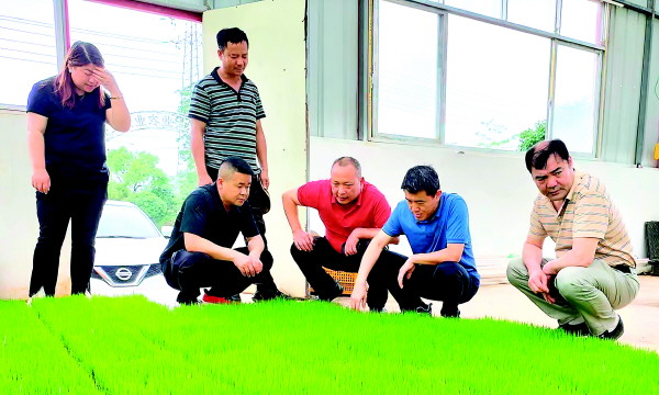 ▲博士后科技服务团成员在育秧基地调研。(全州县农业农村局供图)