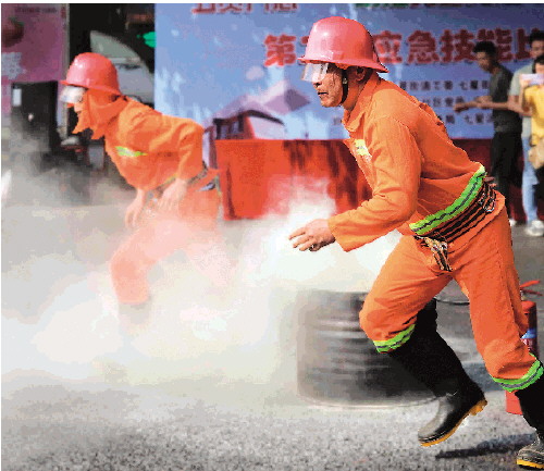 参赛队员开展应急技能比拼。 记者韦莎妮娜 摄