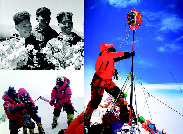 拼版照片:左上图为1960年5月登上珠穆朗玛峰峰顶的中国登山队队员王富洲(右)、贡布(中)和屈银华(资料照片,新华社发);左下图为2008年5月8日,北京奥运圣火珠峰传递登山队队员罗布占堆(左)点燃第一棒火炬手吉吉手中的“祥云”火炬(新华社发);右图为2020珠峰高程测量登山队队员在珠穆朗玛峰峰顶开展测量工作。(新华社特约记者扎西次仁 摄)