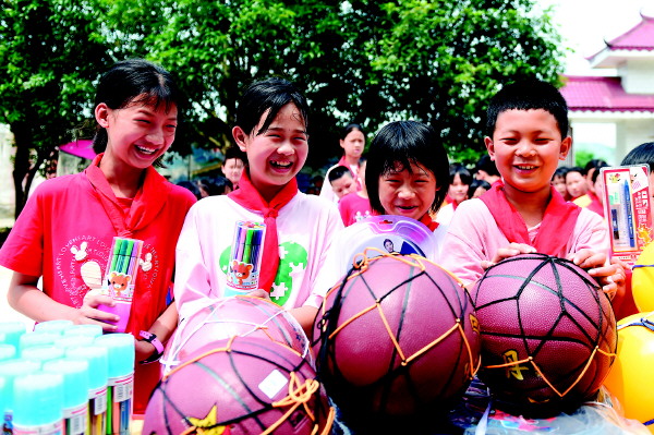 ▲5月31日,在灌阳县文市镇瑶上村小学,学生领到了爱心企业捐赠的书包、文具、篮球等价值5000余元的文体用品。