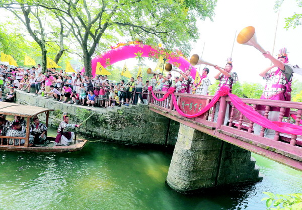 ▲兴安千年古灵渠举行传统的开闸仪式,再现当年辉煌。 记者李凯 摄