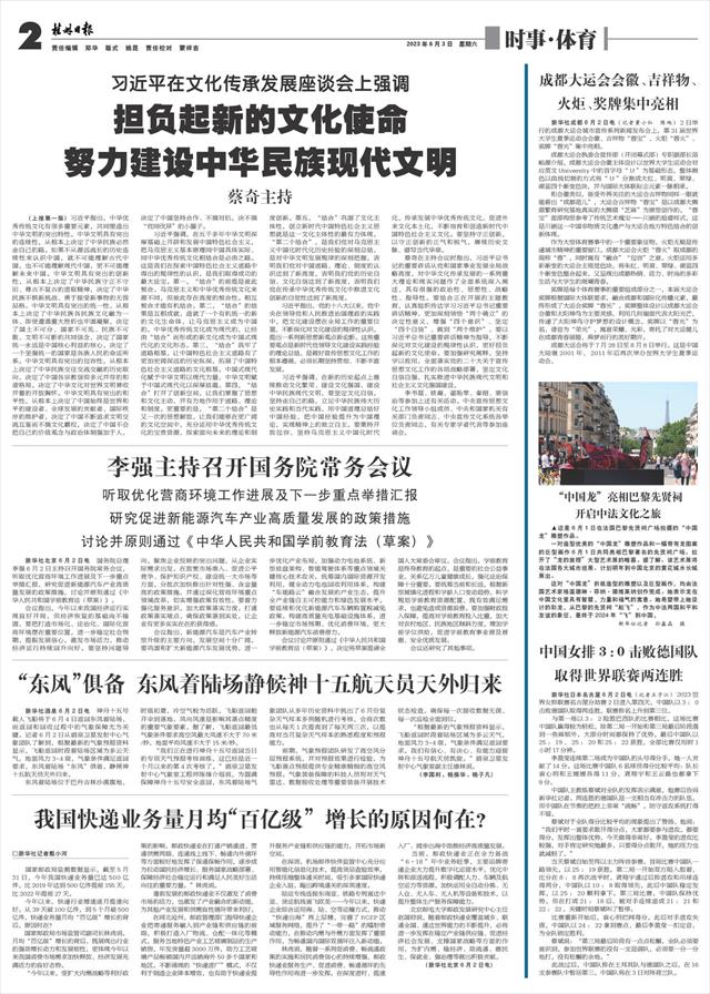 新华社北京6月2日电 国务院总理李强6月2日主持召开国务院常务会议,听取优化营商环境工作进展及下一步重点举措汇报,研究促进新能源汽车产业高质量发展的政策措施,讨论并原则通过《中华人民共和国学前教育法(草案)》。