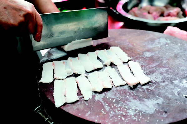 肥肉切成大小均匀的薄片。