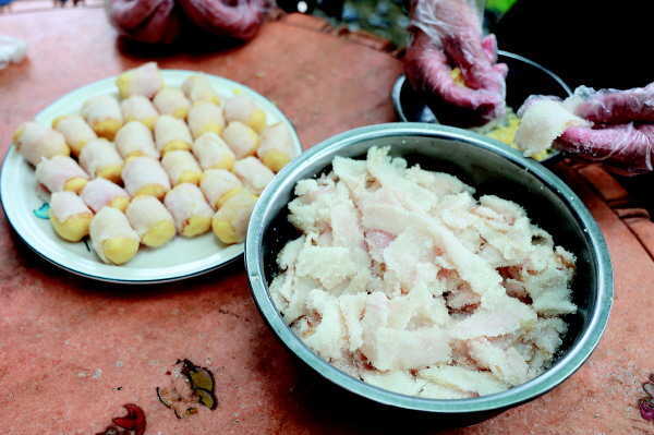 袁素梅说,玻璃扣作为桂林船上人家的一道传统美食,是家家户户过年时必备的“年菜”,也是平日里款待贵客的必备佳肴。平乐人到别人家里做客,也总以吃上了“玻璃扣”,表示宴席的丰厚,并因此倍感主人的盛情。