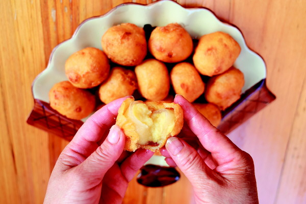 玻璃扣初坯裹上面糊,马上入锅油炸。