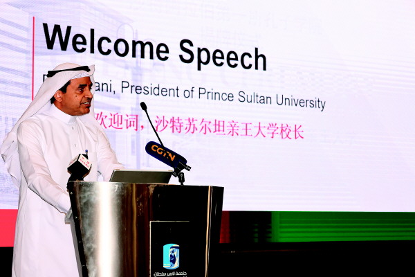 6月4日,在沙特阿拉伯首都利雅得,苏尔坦亲王大学校长艾哈迈德在苏尔坦亲王大学孔子学院揭牌仪式上致辞。