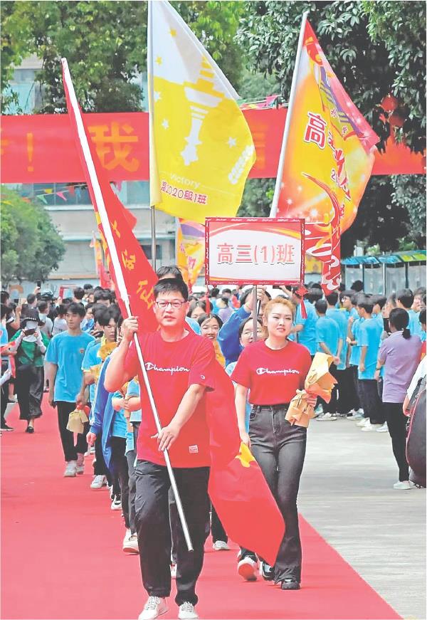 6月6日上午,桂林市逸仙中学为高三年级学生举行出征仪式。图为该校副校长邱家谱高举旗帜带领考生踏上红地毯奔向“成功门”。(图片由桂林市逸仙中学提供)