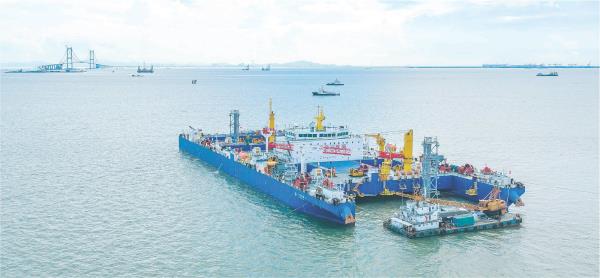 “一航津安1”号沉管运输安装一体船在沉放安装E23管节和最终接头,背后是建设中的深中通道伶仃洋大桥(6月9日摄,无人机照片)。新华社发