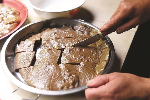 在等待栎子糊凝固期间,舒金花打起了油茶。“刚煮好的栎子糊自然冷却需要两三个小时,想要更快,也可以放到冰箱里进行速冻。”约半小时后,她从冰箱里拿出来,这时的栎子糊已经凝固成了棕黄色的块状,用手一按还有点弹性。“这就是栎子豆腐了!”她用刀子把栎子豆腐划成小块,像豆腐一样。
