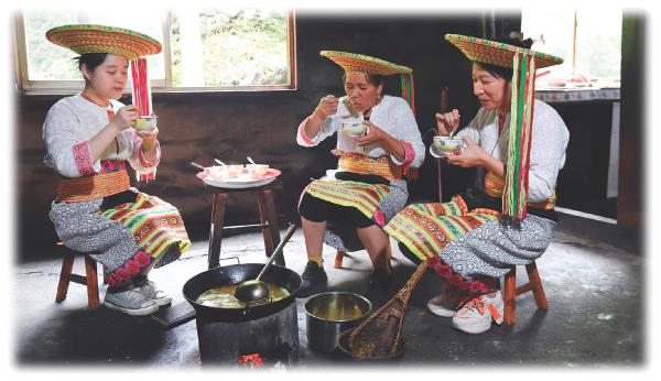 舒金花和姐妹们在品尝放有栎子豆腐的油茶。