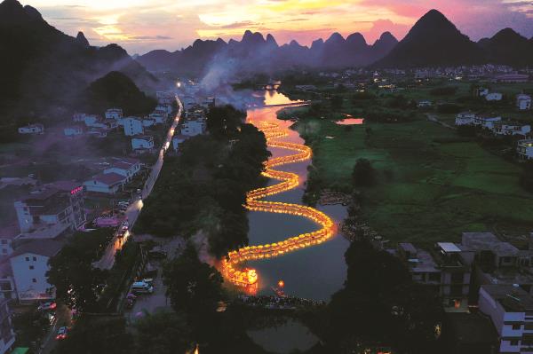 在传统佳节“端午节”即将来临之际,6月18日晚,阳朔县白沙镇遇龙村遇龙河上,一条由55张竹筏组成的550米长的金色“巨龙”蜿蜒巡游在河面,与秀美的山水交相辉映,十分壮观,吸引了众多市民游客前来观看。记者李忠波 摄