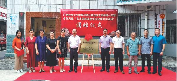 本报讯(记者胡晓诗 文/摄)为丰富民主党派基层组织活动,搭建学习交流实践平台,提升广西社会主义学院实践教学质量,6月16日上午,广西社会主义学院与致公党桂林市委秀峰一支部合作共建“民主党派基层组织实践教学基地”揭牌仪式在秀峰区广西仁者社会工作服务中心举行。