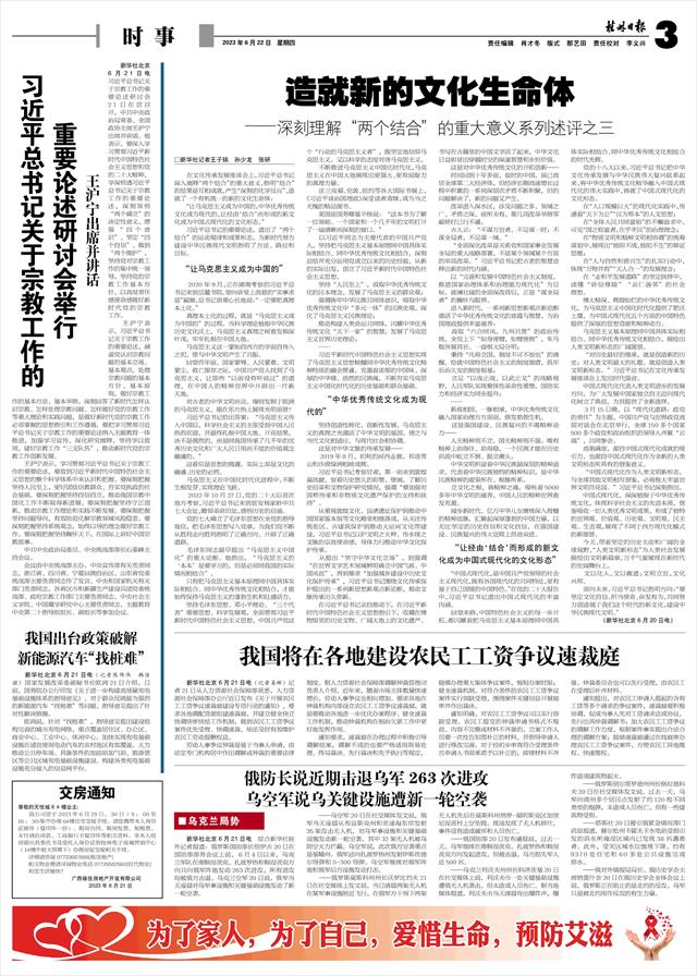 新华社北京6月21日电 习近平总书记关于宗教工作的重要论述研讨会21日在京召开,中共中央政治局常委、全国政协主席王沪宁出席并讲话。他表示,要深入学习贯彻习近平新时代中国特色社会主义思想和党的二十大精神,学深悟透习近平总书记关于宗教工作的重要论述,深刻领悟“两个确立”的决定性意义,增强“四个意识”、坚定“四个自信”、做到“两个维护”,坚持党对宗教工作的集中统一领导,坚持党的宗教工作基本方针,以高度责任感使命感做好新时代党的宗教工作。