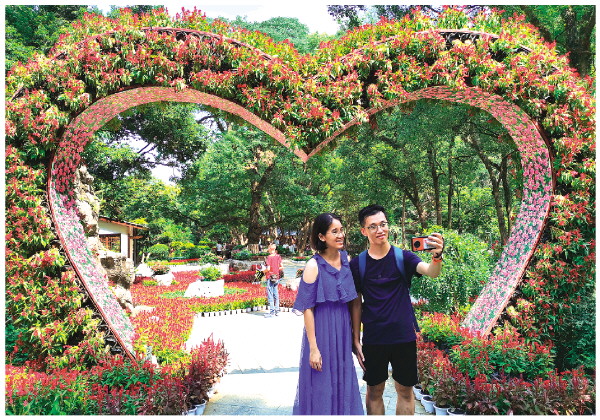 为助力桂林打造世界级旅游城市,迎接暑期旅游高峰的到来,近期,七星·骆驼山景区在乐水瀑布景点打造了“山水花境”景观。该景观以瀑布参差错落的地貌为基础,用鸡冠花、长春花、孔雀草、太阳花等品种花卉共3万多盆布置了精美花境,构造了山水花影的雅趣,为市民、游客展示了山林的唯美意境,寓意“绿水青山就是金山银山”,并祝愿广大市民、游客日子越过越红火。图为游客正在“山水花境”景观前留影。 记者徐莹波 摄
