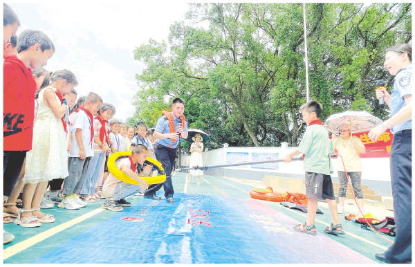 在校园安全小课堂上,巫晓曦在模拟水域指导学生们进行防溺水演练。记者陈静 摄