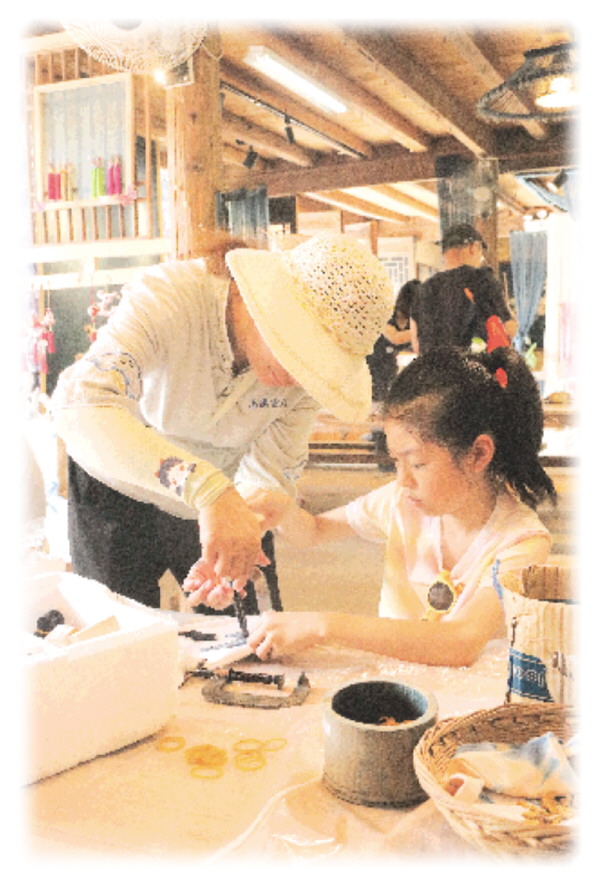 开幕式上,来自浙江的艺术家宋立在舞台一旁铺开10米×2.4米的布卷,当场为游客表演蜡染绘画。“今天来了许多年轻设计师,我希望有更多年轻人和高校师生参与进来,传承我们的传统手工艺。”宋立告诉记者,一幅蜡染成品要经过10次染色,才能呈现出完美的效果。随后,记者来到扎染制作手工坊,有不少小朋友正在手工艺者的协助下体验扎染技艺。
