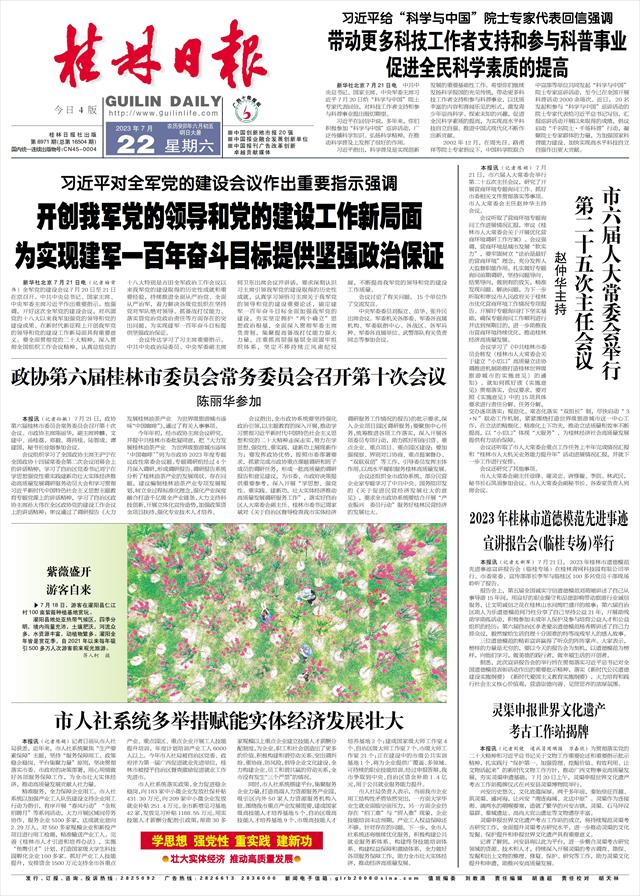 宣讲报告会(临桂专场)举行   本报讯(记者文新军)7月21日,2023年桂林市道德模范先进事迹宣讲报告会(临桂专场)在桂林青网科技园有限公司举行。市委常委、宣传部部长李军与临桂区100多名党员干部现场聆听了报告。