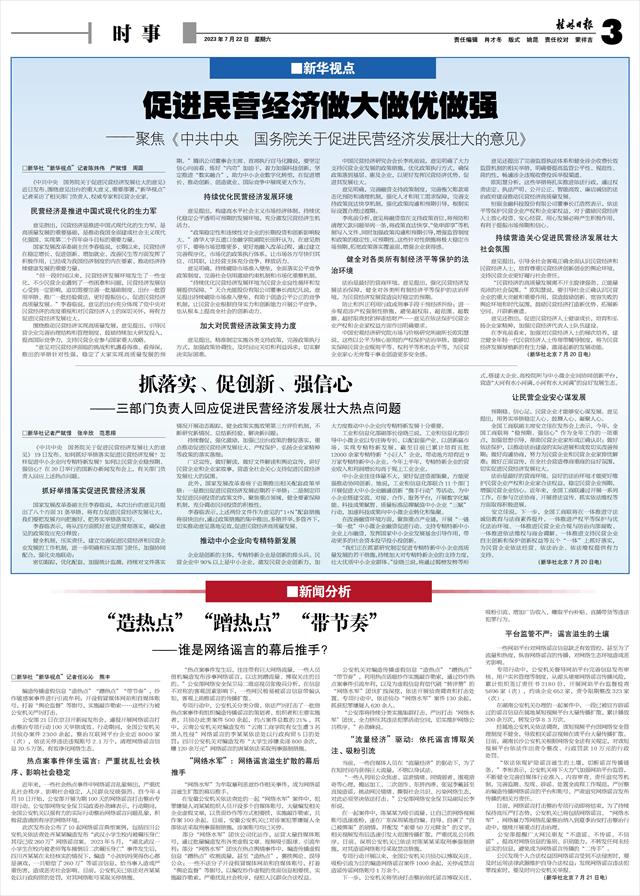 抓落实、促创新、强信心 ——三部门负责人回应促进民营经济发展壮大热点问题 □新华社记者严赋憬 张辛欣 范思翔