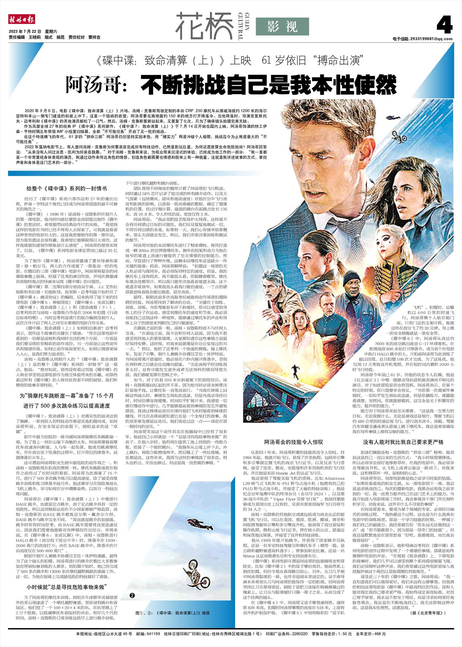 《碟中谍:致命清算(上)》上映 61岁依旧“搏命出演” 阿汤哥:不断挑战自己是我本性使然   2020年9月6日,电影《碟中谍:致命清算(上)》片场,汤姆·克鲁斯驾驶定制的本田CRF 250摩托车从挪威海拔约1200米的海尔瑟特科本山一侧专门建造的斜坡上冲下。这是一个陡峭的岩壁,阿汤哥要在离地面约150米的地方打开降落伞。当他降落时,导演克里斯托夫·迈考利和《碟中谍》的其他演员都松了一口气。然后,汤姆·克鲁斯重新站起来,又重复了七次,只为了确保镜头拍摄完美无缺。