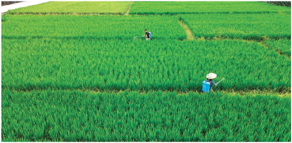 华侨旅游经济区沙洲村种植户为稻田喷洒农药。
