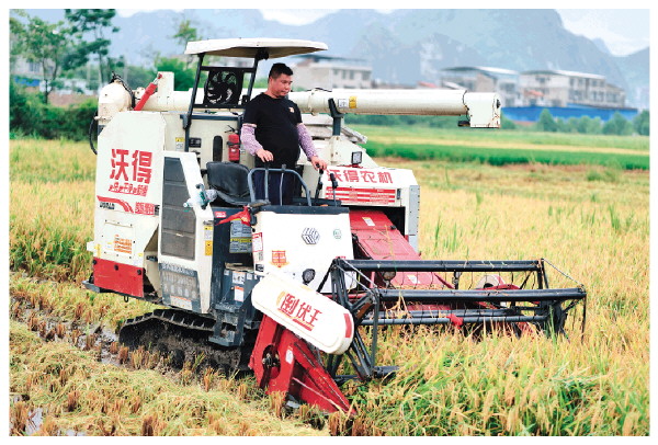 灵川县定江镇种植户收割已经成熟的稻谷。