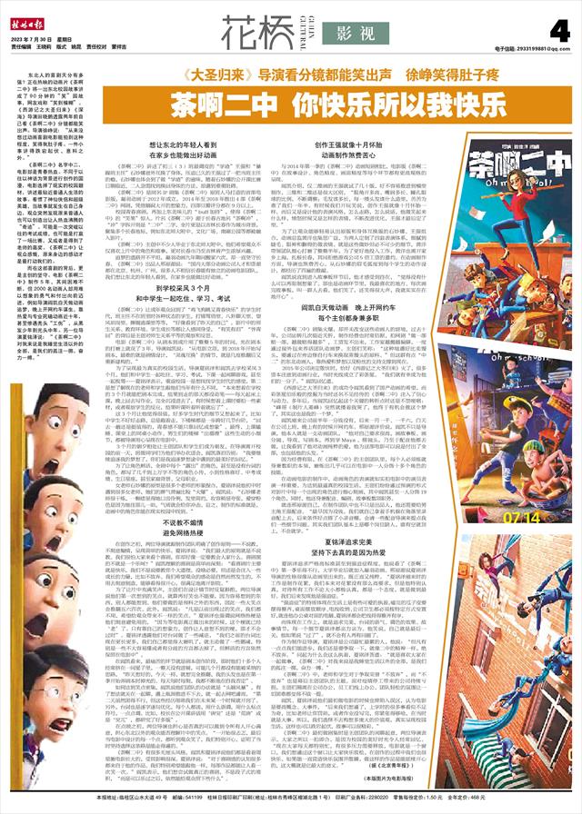 《大圣归来》导演看分镜都能笑出声 徐峥笑得肚子疼 茶啊二中 你快乐所以我快乐   东北人的喜剧天分有多强?正在热映的动画片《茶啊二中》将一出东北校园故事讲成了90分钟的“笑”园故事,网友戏称“笑到模糊”。《西游记之大圣归来》《深海》导演田晓鹏透露两年前自己看《茶啊二中》分镜都能笑出声。导演徐峥说:“从来没想过动画喜剧电影能拍到这种程度,笑得我肚子疼。一件小事讲得跌宕起伏、意料之外。”