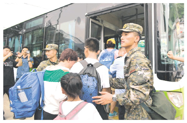 8月2日,在北京市门头沟区妙峰山镇政府附近,武警北京总队机动三支队官兵引导旅客排队乘坐大巴转移。 当日,因强降雨被困北京门头沟山区的列车旅客陆续安全转移。 新华社记者鞠焕宗 摄