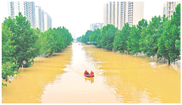 8月2日,救援人员在河北省涿州市市区乘坐冲锋舟前去转移受灾群众(无人机照片)。新华社记者牟宇 摄