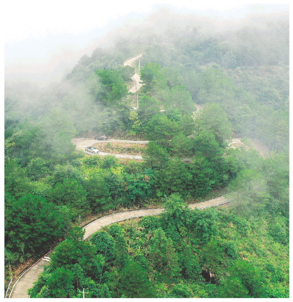 8月2日,恭城瑶族自治县莲花镇云雾萦绕,蜿蜒的公路盘绕着苍翠青山,美不胜收。