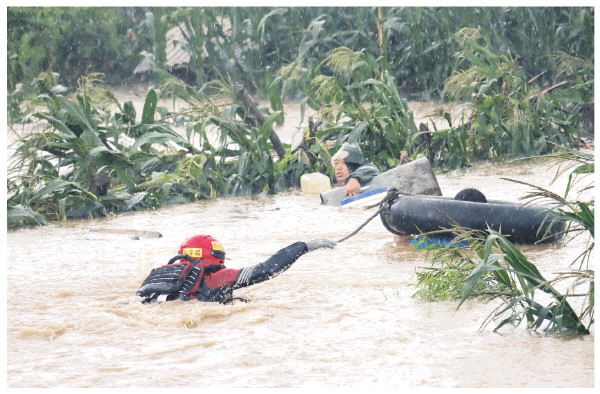 8月4日,哈尔滨市森林消防支队特勤大队消防员在尚志市一面坡镇万山村跳入激流水中,营救被困群众。