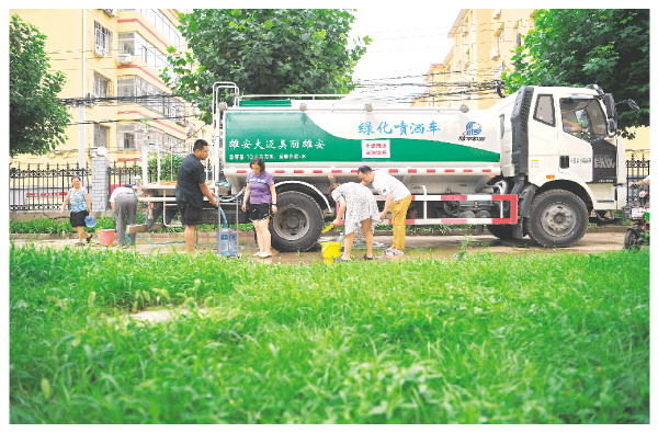 8月4日,河北省涿州市新星小区居民从供水车里接水。