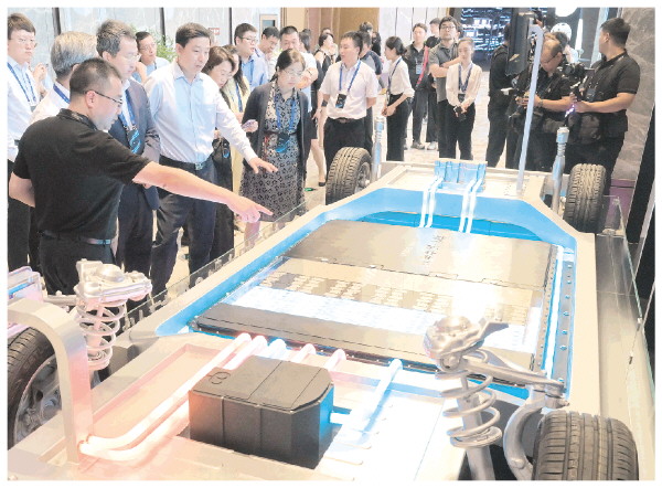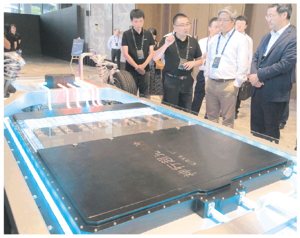 8月16日,工作人员向参观者介绍宁德时代发布的神行超充电池。