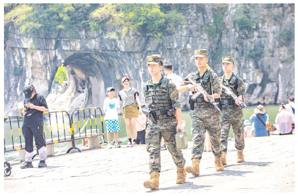 此时,时间已近10点,太阳紫外线越来越强烈,桂林站广场上行走的人们都用上了防晒服、遮阳帽、遮阳伞等“装备”。在售票处门口等待巡逻小组组长归队的欧锦机和战友鲁宝君笔直地站立着。他们身着夏季作训服、战术背心、作战鞋,佩戴执勤腰带、执法记录仪、对讲机,手握钢叉、盾牌等规定装备,巡视着周围人群的一举一动。