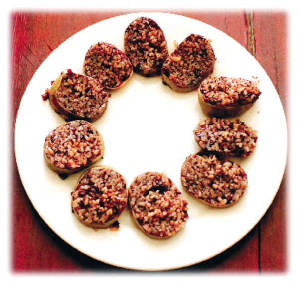 刚出锅的猪血肠,颜色变得深红,肠子的颜色趋近于透明,存在感变弱,透过肠子,可以看见颗粒分明的糯米。盆大姐将猪血肠捞出、放凉,约10分钟后,就可以将猪血肠切片了。“现在就可以直接吃,但是我们一般都是拿来配油茶,需要再煎一下,吃起来更香。”于是盆大姐将切好的猪血肠拿到锅上煎,香味果然扑面而来。记者夹起一块,煎过的猪血肠,四周焦香,血肠里的糯米吃起来很有嚼劲,咸味适中,猪血也没有腥味,确实是搭配油茶的又一美食。