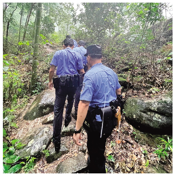 “簌簌……噼啪……”8月23日正值处暑,记者跟随猫儿山派出所巡护队一同巡山。空气里仍飘荡着饱满的暑气,在山林间穿梭,汗水从巡护队员的脸颊流下,一眨眼便沁入了整齐严实的藏蓝色领口。