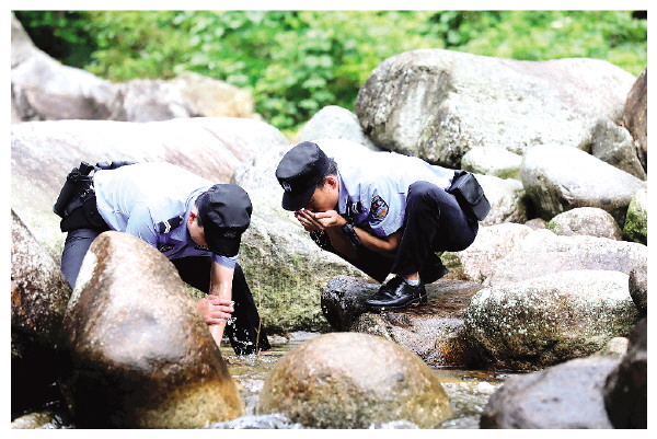 巡护队员在山里巡护时一般都不带水,渴了喝点山泉,热了就用山泉洗把脸凉快一下。