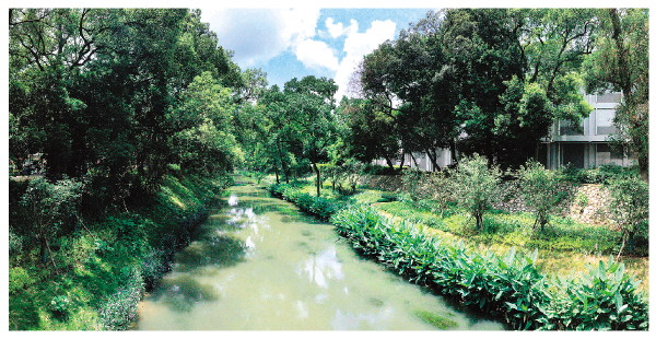 近日航拍黑山植物园西侧的南溪河,河道缓冲带生长的水生植物生机勃勃,新建的生态护岸和河道缓冲带(浅滩)的树木和灌木丛错落有致。