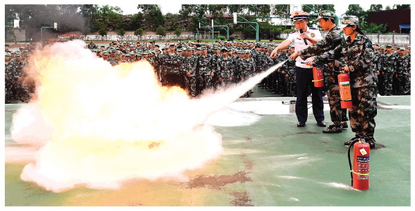消防救援人员指导学生正确使用灭火器。记者李忠波 摄