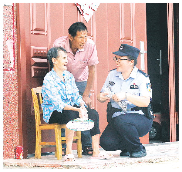 ▲警务助理王丽芳对村民进行走访宣传,加强村民的生态环保意识。