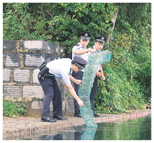 ▲巡逻民警在河中发现一条地笼,立即进行清理收缴。